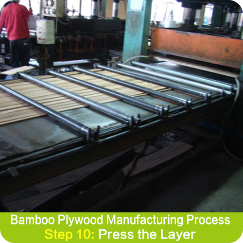 The temperature is 100-110°C and the pressing time is 10-12 minutes. For 3 layers of 3/4 bamboo plywood, we do 3 times of pressing, first step is to press surface and bottom layer, then the core layer and the last is to press 3 layers together. We need sand the core layer smoothly before the final lamination; this can enhance the bonding strength. The plywood requires cooling in a press to prevent deformation and to ensure the board's flatness.Trimming: