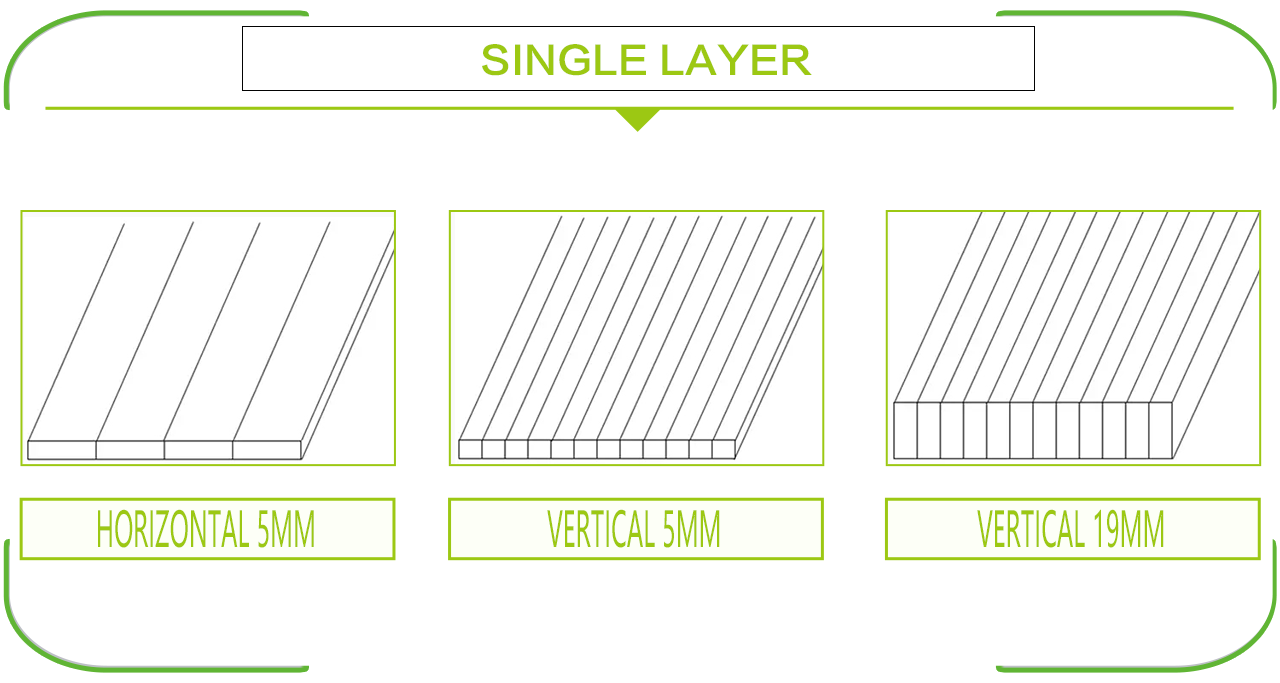 Single layer: 5mm in horizontal and vertical, 6mm in vertical only, 19mm in vertical only. The thickness of bamboo strips maximum for single layer in horizontal grain is 5mm, otherwise the back side of strips will have some defects, looks very terrible, so we only do 5mm thickness. But for 6mm, it will be OK, because the strips will be pressed together vertically, the face side will be always perfect, no holes, no cracks. The most cost-effective thickness is 19mm for 1 layer, because this is original height of each strip stands vertically, no need of splitting and any extra cut.